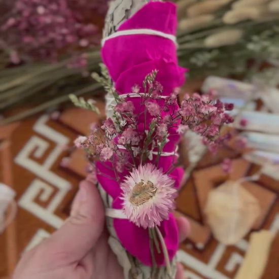 Wellness Product Details: Each smudge stick is approximately 18cm (7") long and is thickly bundled with White Californian Sage and adorned with florals. This item is made from organic matter so drying and changing rose colour petals is natural.